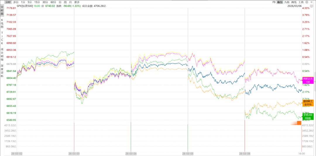 美股方面,由于油价飙升,就业衰退和中东冲突,美股三大股指本周均录得跌幅,扭转了本周之前低开高走的局面。