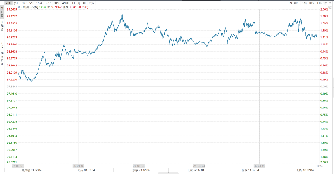 外汇方面,本周美元指数受益于地缘冲突、经济数据反弹(不含非农)和滞胀交易。DXY周线上涨超过1.3%,为2024年11月以来最佳单周表现,盘中多次突破99关口,自高触及99.69。
